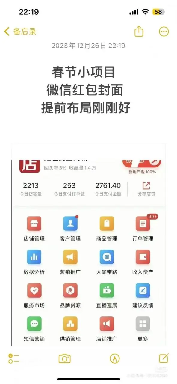 新年是中国人民最重视的节日,每到过年大家一定要做的事情就是互相发红包,家长给子女,男朋友给女朋友,老板给员工,传统的微信红包界面非常的普通,所以说新颖的红包封面非常的吸引眼球这里给大家展示一下传统红包跟自定义红包的不同之处。大家可以看到啊这种红包界面是非常吸引人的,你给朋友转这样的红包,人家都会问到你,你这个红包怎么不一样,非常有成就感,红包售价一般在10元左右,这个要自己去制定,大家不要小看这个十元,流量起来之后收入无上限,每年的新年红包都会让一批人赚的盆满钵满,今年的你一定也要跟上,这里我给大家具体说一下是如何去操作的,非常的简单,请大家一定要看完。