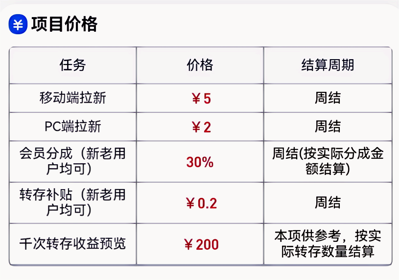 网盘拉新,简单来说,就是各大网盘服务商为了吸引新用户而推出的推广活动。参与者只需将资料上传至网盘并分享给他人,当他人成为平台新用户并完成资料转存时,分享者即可获得相应的拉新奖励。目前,夸克网盘、迅雷网盘和UC网盘等主流网盘都在开展此类活动。有个亮点就是【今年3月份正式推出百度网盘拉新】