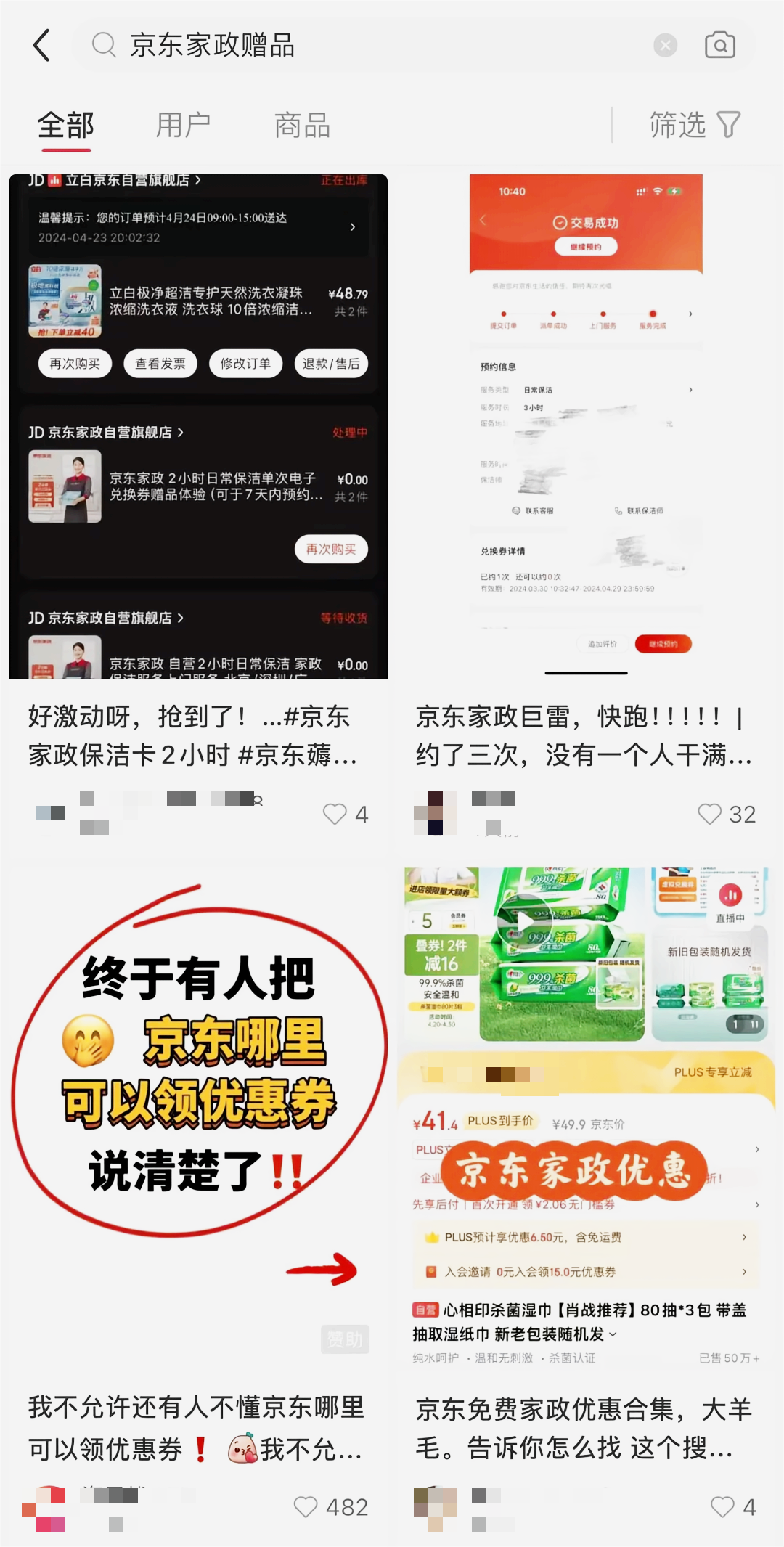 - 小红书探索:同样,在小红书上搜索“京东家政赠品”,也能找到很多相关商品。