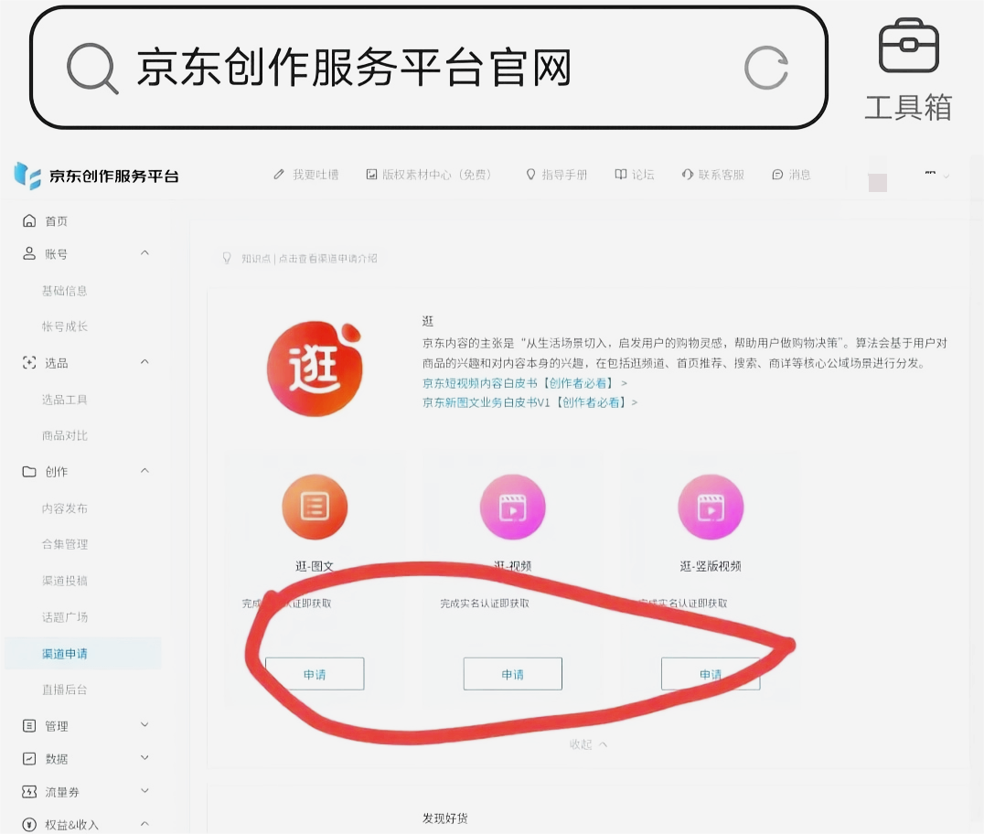 首先,你需要一个实名认证的京东账号。然后搜索“京东创作服务平台”并登录进去,开通相关权限。只要你的账号是实名的,开通权限基本秒过!