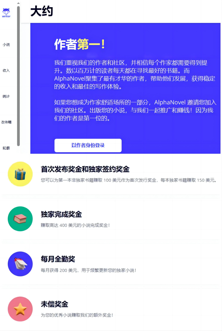 - 发布小说:在Alphanovel上,发布第一本非独家书籍可以赚取100美元的首发奖金。如果是独家书籍,可以获得150美元。完成一本小说后可以获得400美元的奖金,每月还有200美元的全勤奖。