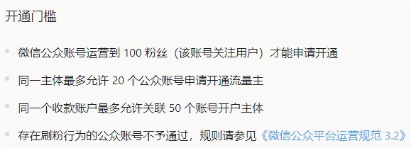 - 公众号的流量主功能门槛降低,100粉丝即可开通,但要实现广告插入,仍需达到500粉丝。