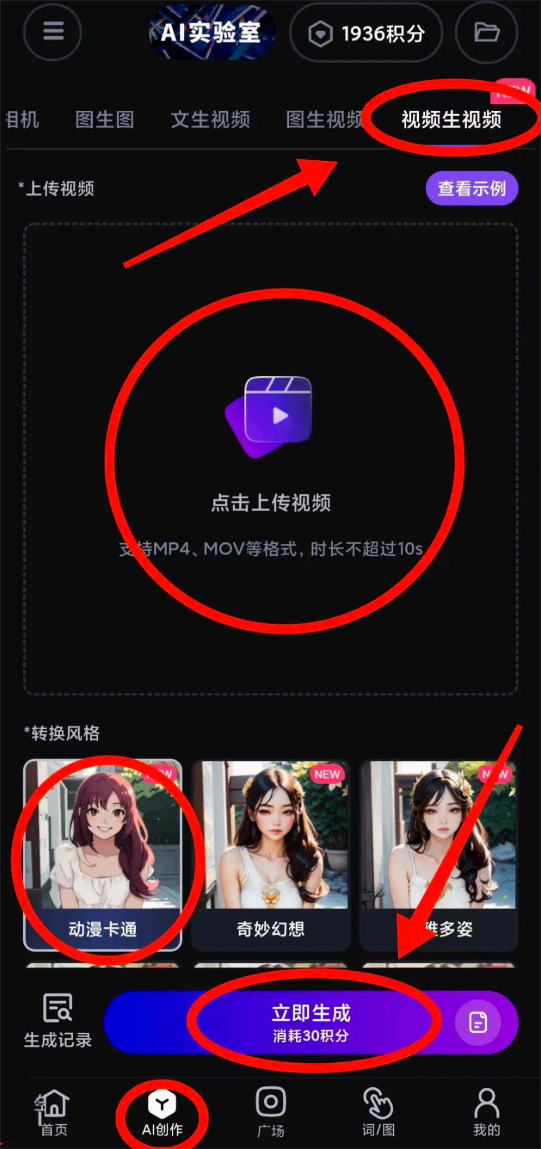 接下来,咱们要使用一个强大的AI创作工具来进行二次创作。打开无界或其他类似的AI创作平台后,选择“视频生视频”功能并上传保存好的视频素材。在风格选择上,你可以尝试一些新颖、独特的风格来吸引观众的眼球。然后点“立即生成”等待片刻即可。